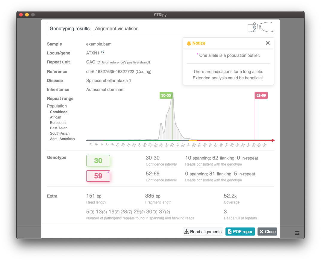 STRipy's pipeline version is a non-graphical command-line version which is merged from STRipy's Server and Client. The pipeline version can be integrated into pipelines and can genotype multiple loci at the same time. Analysis report can be saved as HTML file for easy viewing of results. Click here to see a demo report!